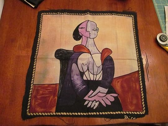 I can honestly say that I've never worked with a Picasso; I've always thought of his art as pretty bizarre and somewhat alien. Still, something about this particular piece is very compelling. I like the colors and the strong lines, and the lady's face is both tranquil and mysterious. Making this into something else presents an interesting challenge for me.