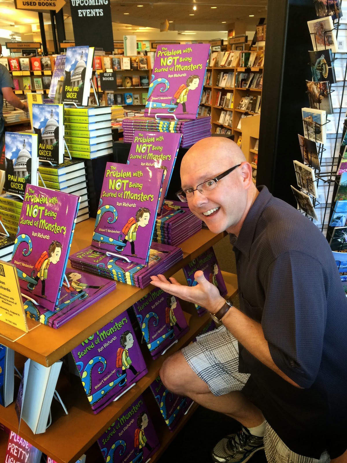 I first got acquainted with Dan Richards at the Los Angeles SCBWI conference, a year ago. We hit it right off and that had nothing to do with the fact he was wearing a superhero costume, complete with foam muscles. It didn't take me long to figure out that Dan had worked hard learning his craft and the business. I was out of town for the book launch of his first book, The Problem With Not Being Scared of Monsters, but his post below put me right in the scene. Take it away, Dan!