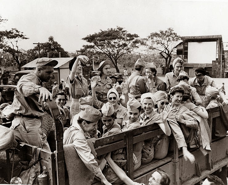 Nurses in truck are leaving Santo Tomas after liberation; photo: US Government