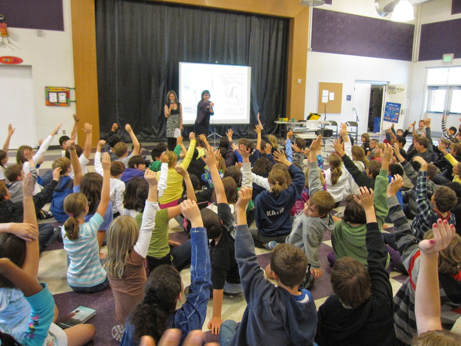 Tons of questions for Mary Nethery and me!One of the things I enjoy most about school visits is that I don’t know which kids are A students and which have their own chair in the principal’s office. Sometimes when I call on a child, I can hear a collective gasp from the teachers, nervous about what that particular child might say or ask. But you know, in all the years I’ve been doing this, I’ve never had a disrespectful comment or question. And nine times out of ten, that “problematic” student turns out to be the one who comes up to me afterward to show me something she’s been writing on her own. When that happens, I feel like I’ve hit a homerun clean out of the ballpark.