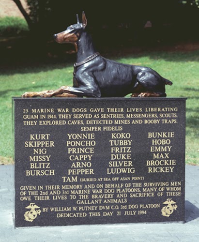 Capt. Putney could never forget those dogs, nor how much they meant to the men they partnered with. He made sure they were given appropriate burials on Guam, in their own dog cemetery. But when he visited the site in the 1980s, he found the cemetery overgrown and unkempt. Capt. Putney was not about to let his “Marines” down and began to fundraise to create a real memorial, complete with statue and plaque.