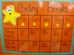Several colleagues at my school are poetry lovers too who incorporate poetry in their teaching on a regular basis. They and many others are supportive of what I am doing in the library and willing to help, which is very significant in showing students that we all value poetry as an important part of reading, learning, and enjoying language. Others are appreciative and willing to try when I approach them with ideas or ask them to encourage their students to read and write poetry. The students are receptive and willing to try writing or sharing poems.