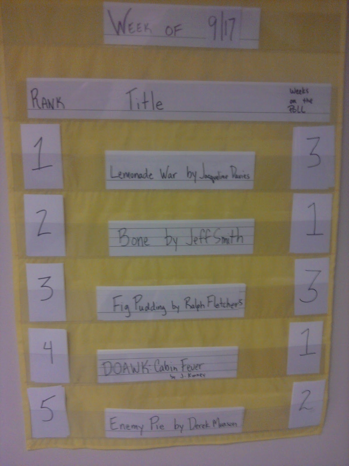 Love that my good friend Derek Munson's on this listWe have this sign outside our room that announces the top books in our room. Each week we all get 2 votes. I tally the votes and redo the sign. It is kind of like the college football polls that come out every week, only better because it is about books and kids are in charge. (ed: my emphasis) The only real rule we have is the book must be one we have read fully or have heard read aloud. It can’t be a book we are in the middle of reading or one we think will be awesome.