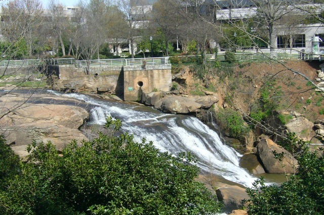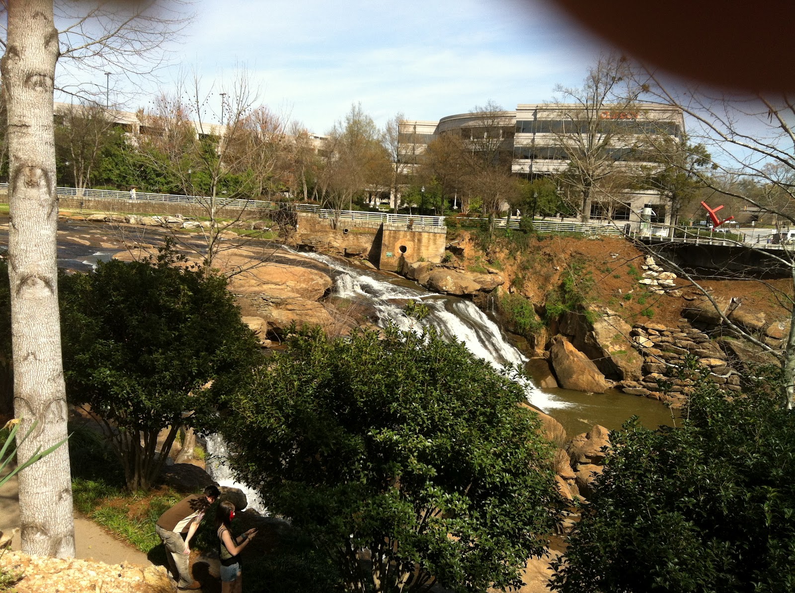 The fact that I've been slow to post in no way reflects on the lovely (but too-brief) time spent in Greenville, South Carolina with the SC Association of School Librarians. In addition to being the hometown of Barbara O'Connor, Greenville is one charming place. During a short break in the action, Mary and I commandeered the Hilton's shuttle and driver and finagled a ride to Reedy River Falls, and the darling downtown. Mary and I did our bit to contribute to local economy!