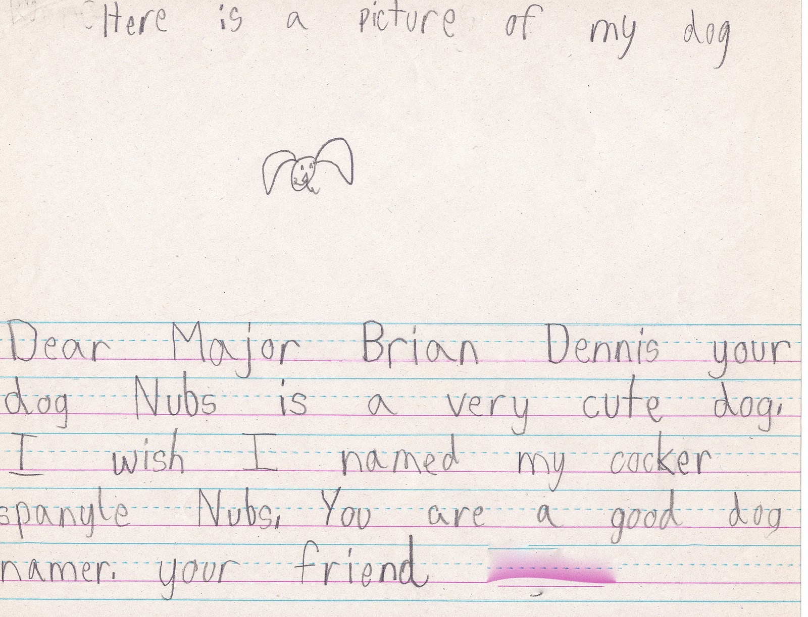 Instead of being complimented for being a dog whisperer, Brian got this letter praising his dog naming abilities. Love it!