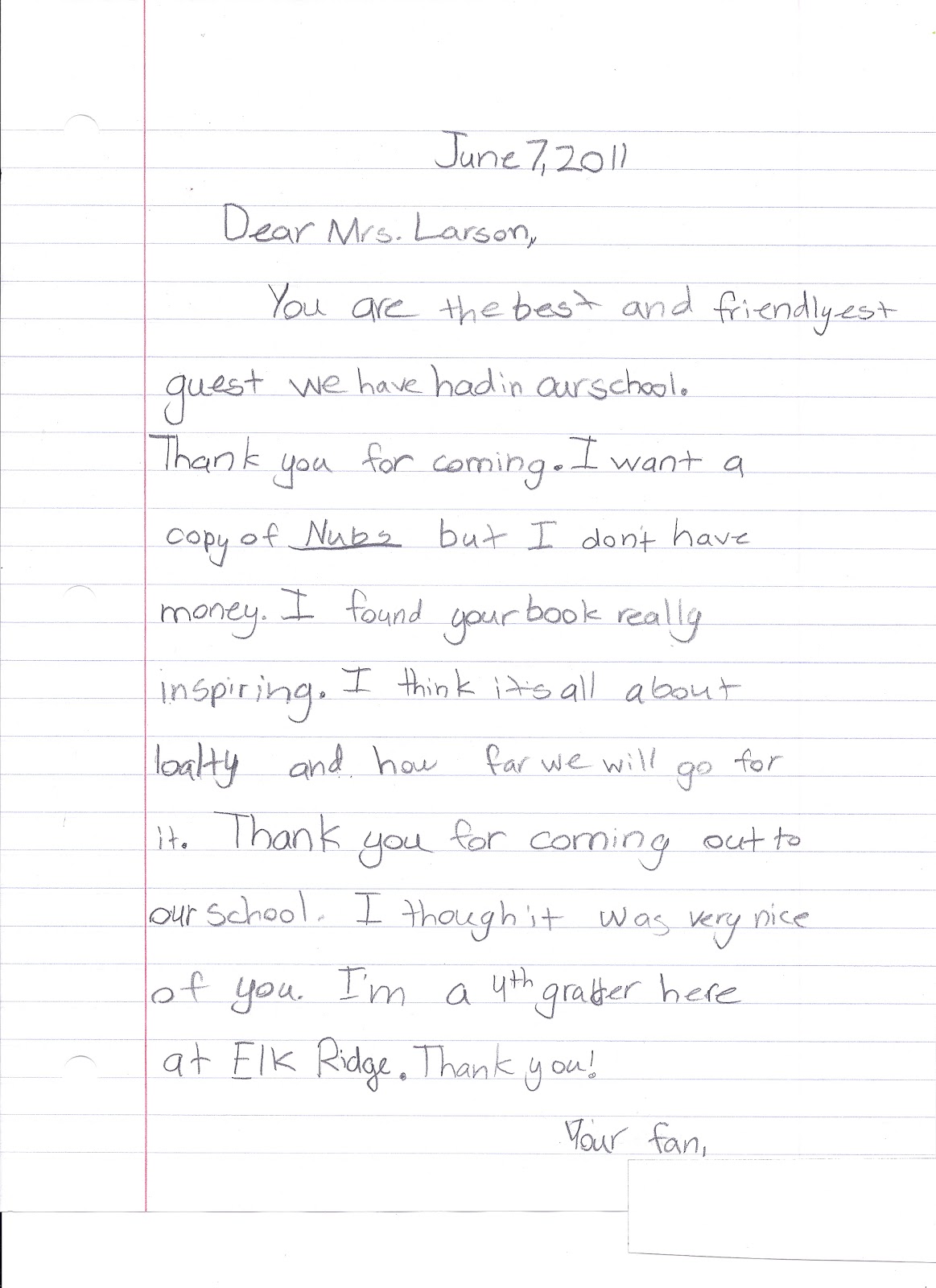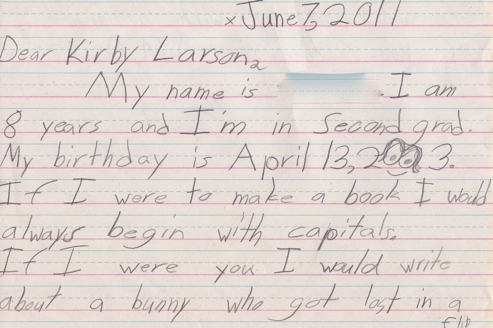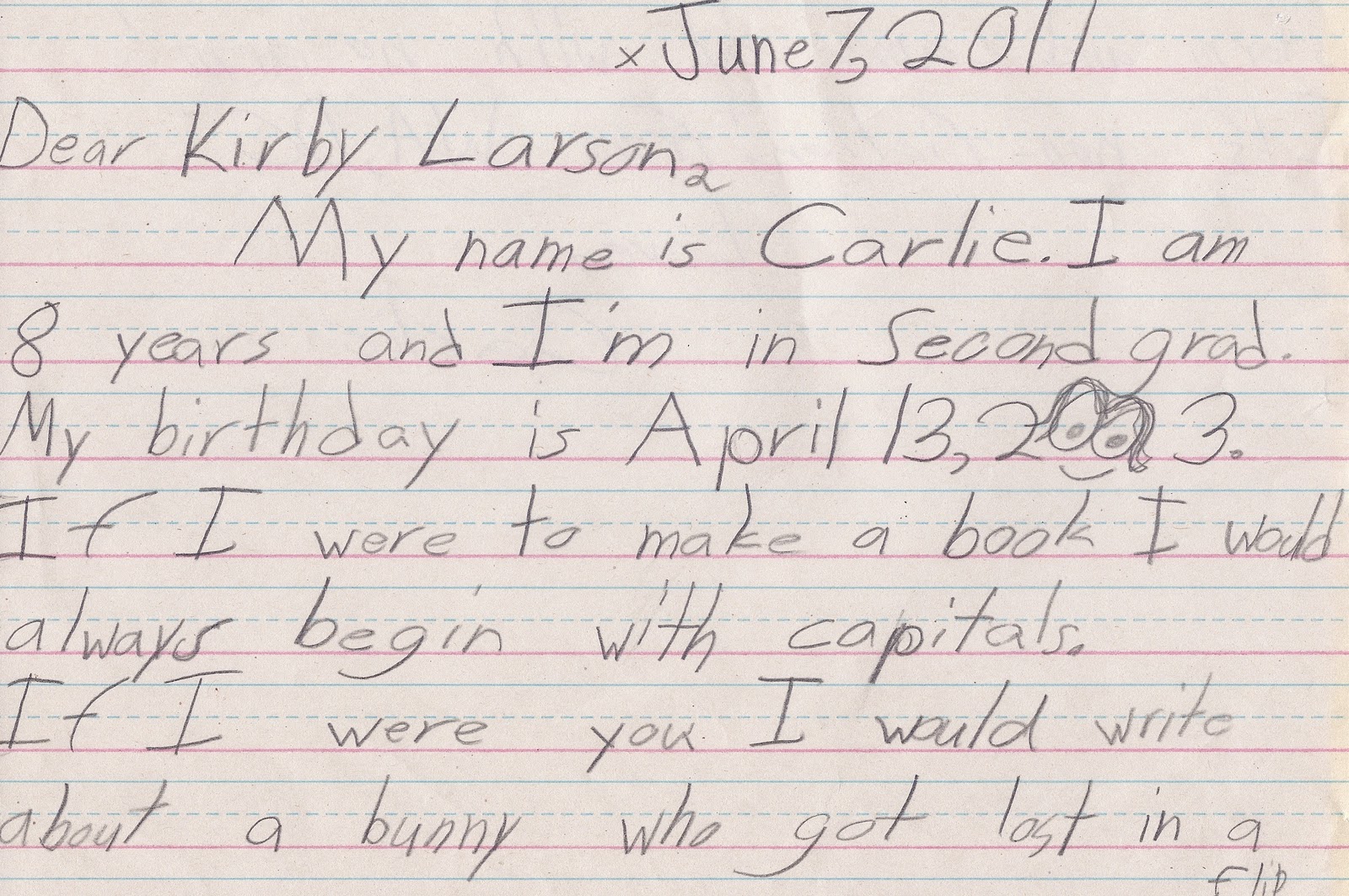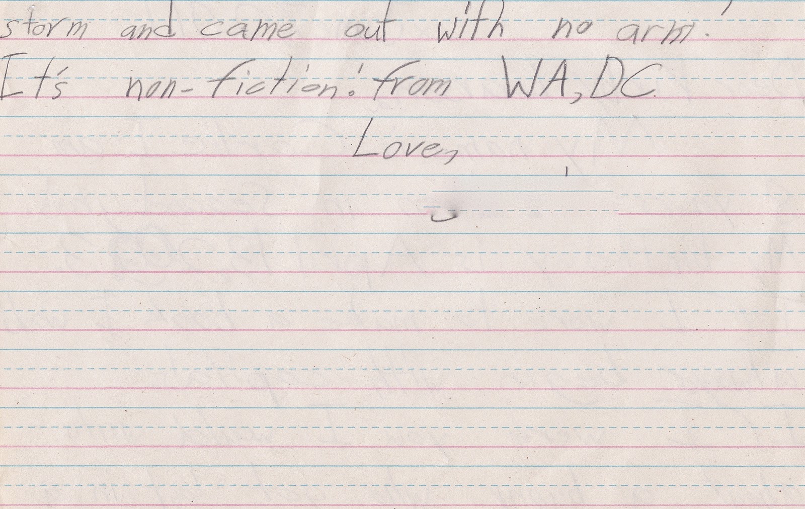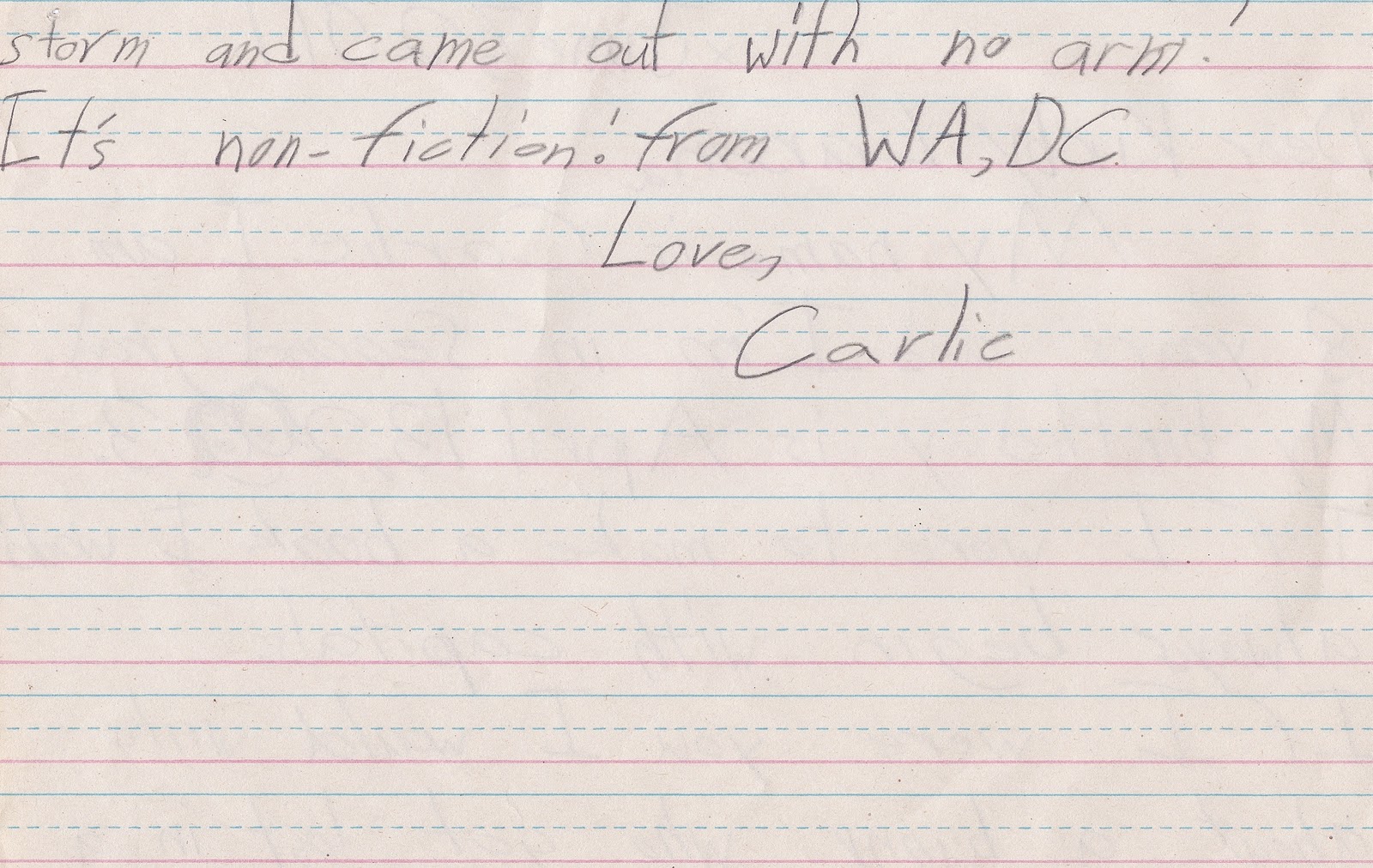 "I am sorry but I did not like your books. I did not like your books because they are a little boring and they teach us about history which I find to be boring too. I also wanted it to be exciting but it was not fun or exciting. But, the only part that was cool was when you took questions from other kids and answered them. I liked that."