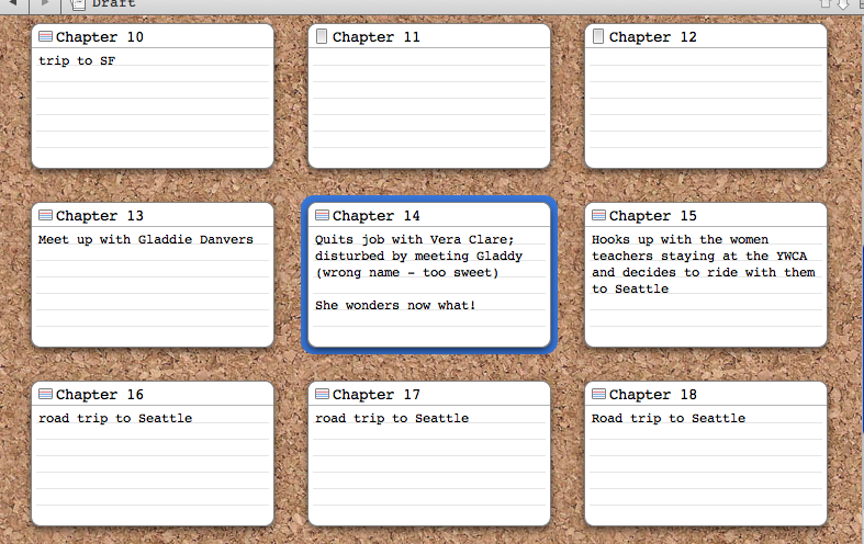 After hitting a wall, so to speak, I got a brilliant idea*. I went back to see how many chapters were in Hattie Big Sky (23). I thought I'd cut myself some slack and guesstimate this new novel at 21 chapters. So I created 21 note cards on Scrivener's virtual corkboard and began to write a sentence or so on each card. Those of you with very sharp eyes will notice that SOME CARDS ARE BLANK.