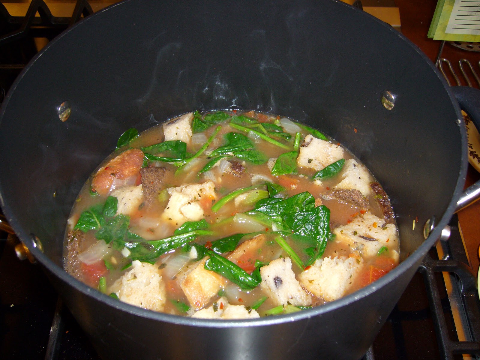 1 T olive oil1/2 onion, diced4 cloves garlic, chopped1 stalk celery, diced1 tsp hot chili flakes1 tsp dried oregano4 cups vegetable stock (I used the chicken I had on hand)1/2 small loaf of stale bread, cubed1 small can diced tomatoes1 bunch spinach (mine was fresh from Full Circle Farms -- yum!)2 T grated Parmesan cheesesalt and pepper to taste