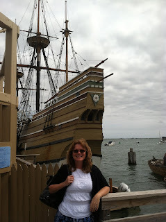 (Lisa Saunders in front of Mayflower II in Plymouth, Mass.)