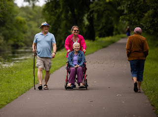 Jim and Lisa Saunders pushing Lisa's mom, Mary Ann Avazian, on the Erie Canalway Trail in DeWitt, New York, for a photo shoot for Erie Canalway National Heritage Corridor. Photographs by Call of the Loon Productions.