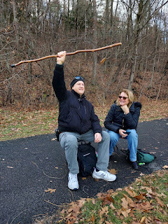 Jim and I like to sit every couple of miles and have found it's best if we carry our own seats. Jim wears a backpack that turns into a stool (from Dick's Sporting Goods) and I bought a light folding stool at a garage sale that clips to my knapsack.