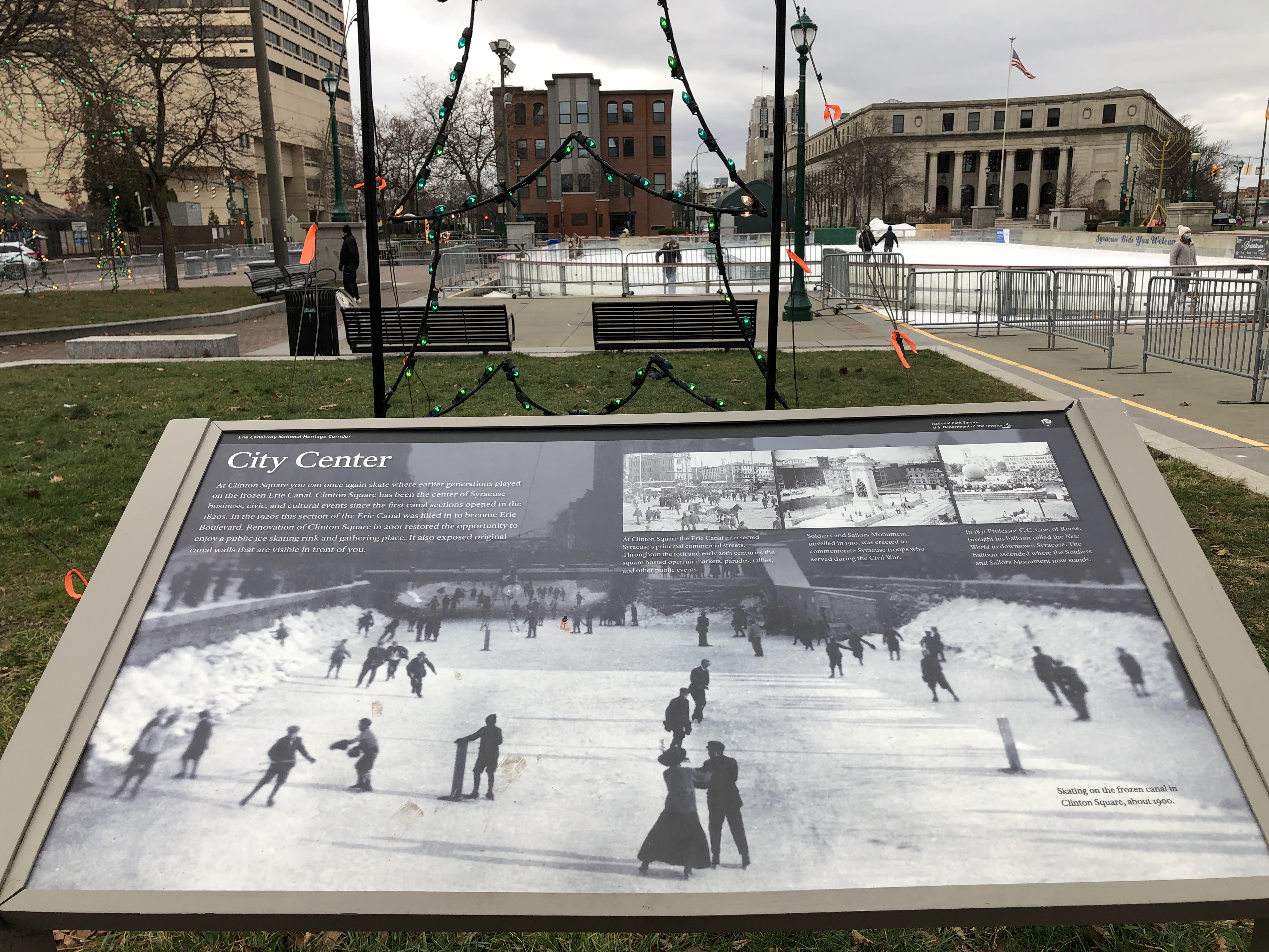 We soon reached the Onondaga Creekwalk,now joined to the Erie Canalway and Empire State Trails.We read signs about salt harvesting and drying as we headed toward Clinton Squareand its stone remnants of the Old Canal—a familiar scene on postcards sent in the mail.