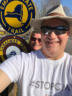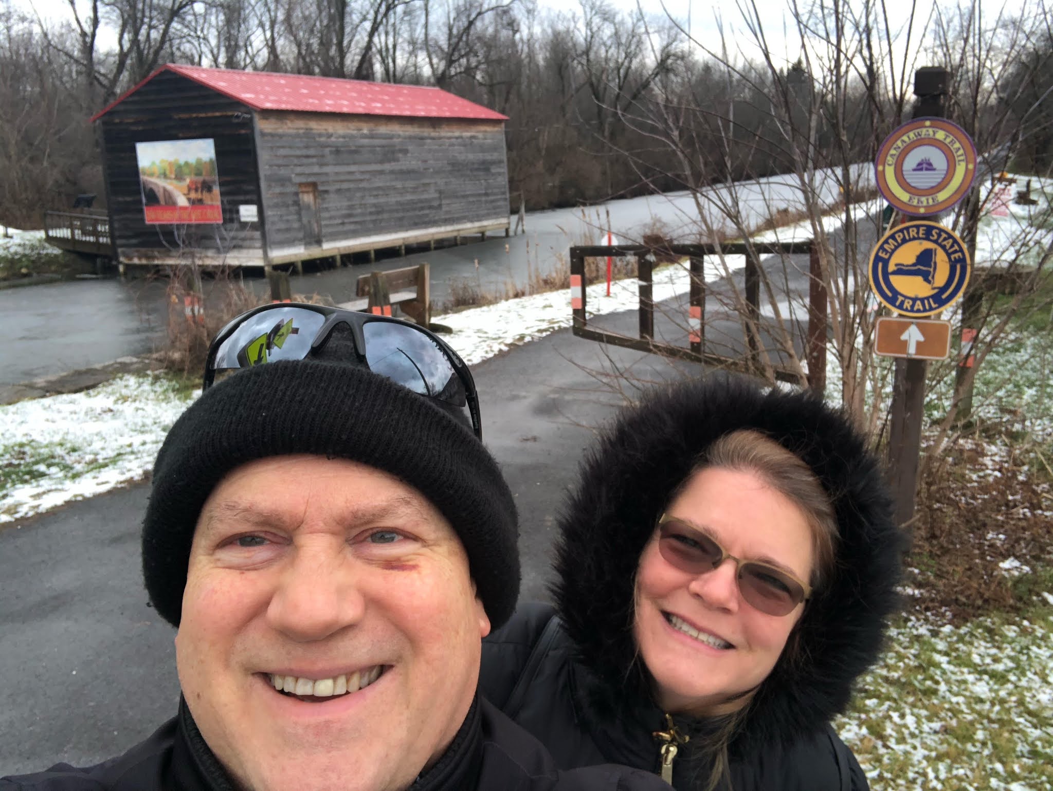 Jim and Lisa Saunders on the Old Erie Canal in Camillus. They are facing the newly built Erie Canal/Empire State Trail at the intersection of Warner's Road. Lisa regularly updates: "Walking the Erie Canal: Secrets of the 8th Wonder, CMV and Pandemic Pizza."