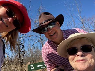 Since we began this new part of the trail in January 2021,we stretched ice cleats over our boots and grabbed walking sticks.At least the cold means we don’t have to pack bug spray—no fear of ticks.