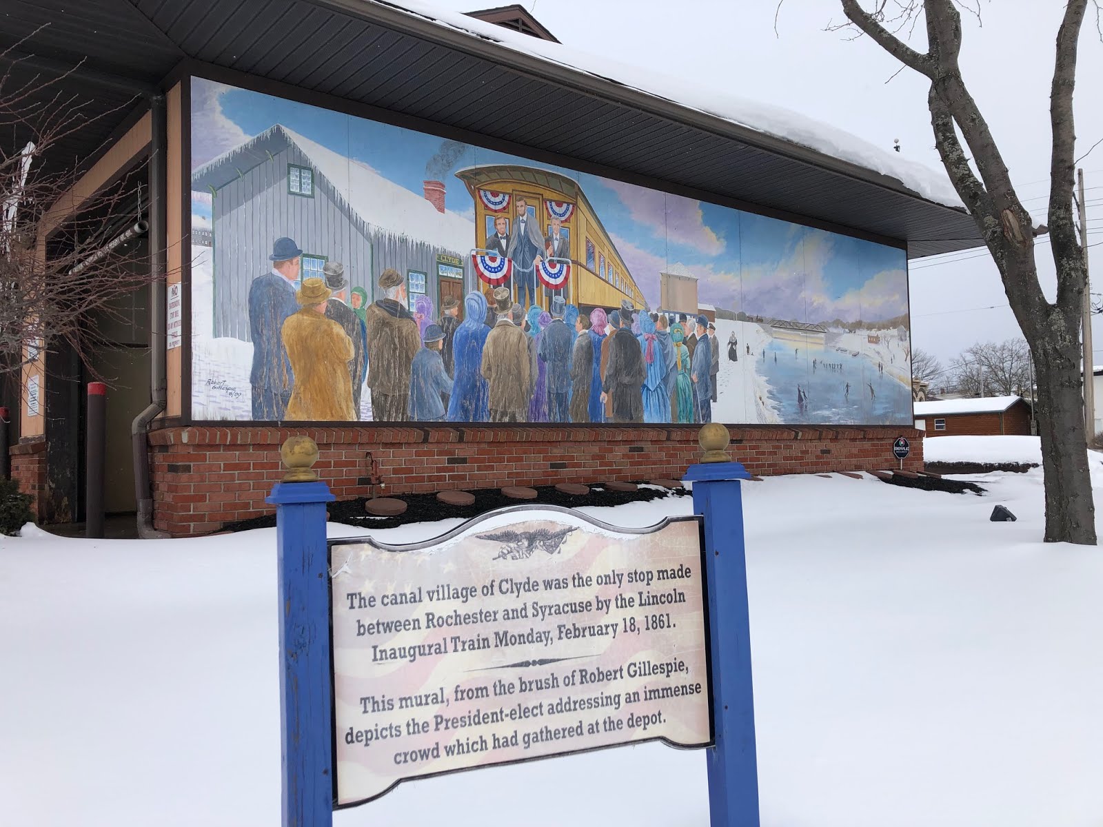 Sign to the mural reads: "The canal village of Clyde was the only stop made between Rochester and Syracuse by the Lincoln Inaugural Train Monday, February 18,1861. This mural, from the brush of Robert Gillespie, depicts the President-elect addressing an immense crowed which had gathered at the depot." Learn more: http://muralmania.org/lincolns-visit-to-clyde-mural/