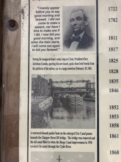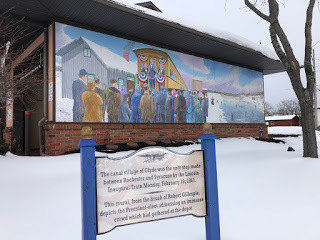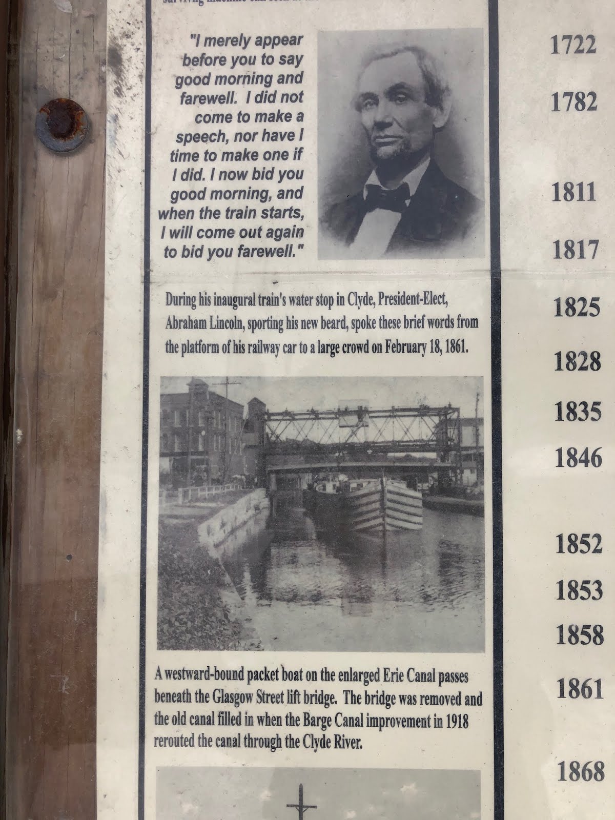 From a sign in Clyde (courtesy of Galen Historical Society) regarding Lincoln's brief visit: "During his inaugural train's stop in Clyde, President-Elect, Abraham Lincoln, sporting his new beard, spoke these brief words from the platform of his railway car to a large crowd on February 18, 1861. 'I merely appear before you to say good morning and farewell. I did not come to make a speech, nor have I time to make one if I did. I now bid you good morning, and when the train starts, I will come out again to bid you farewell.'"