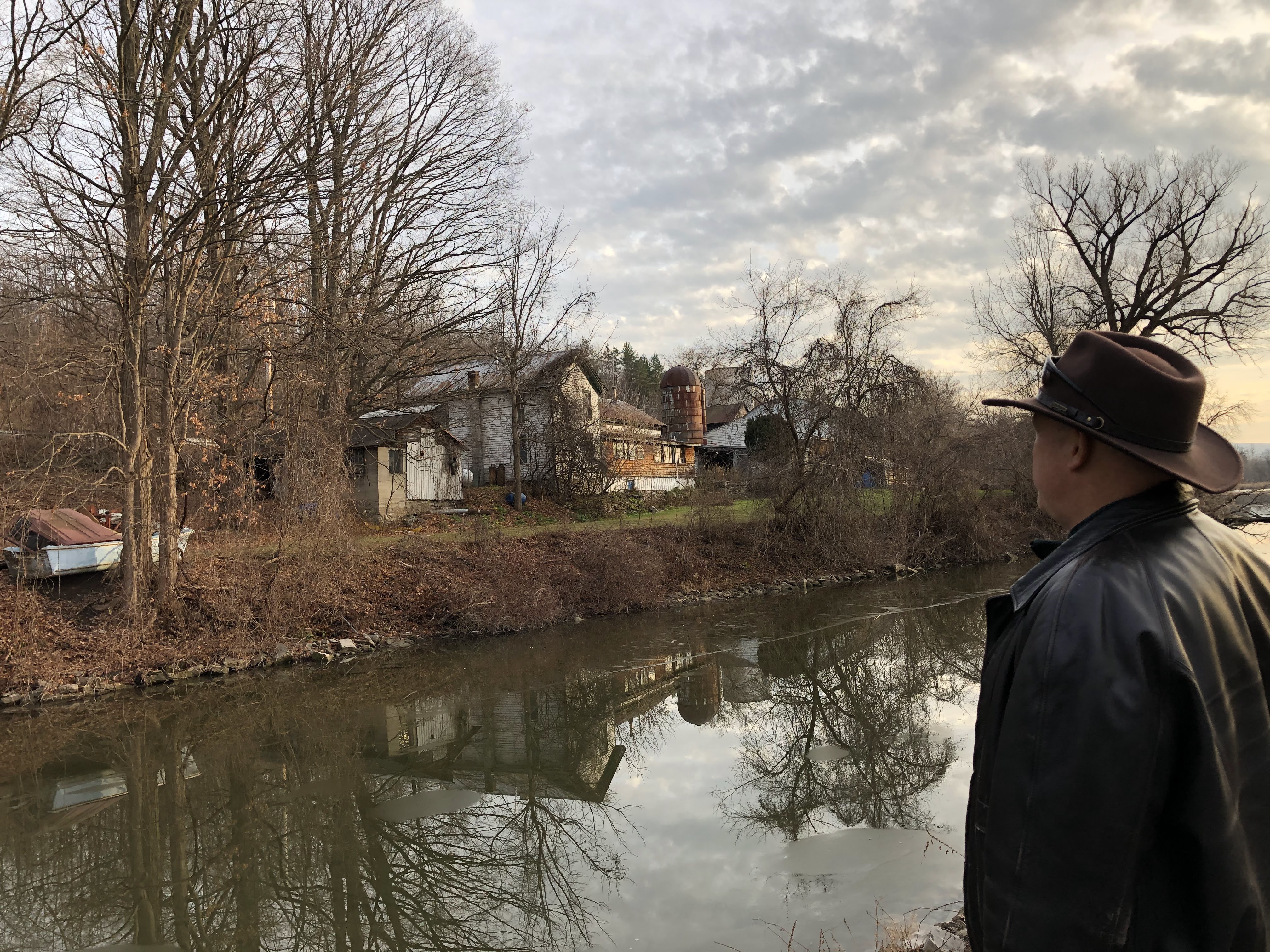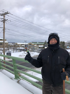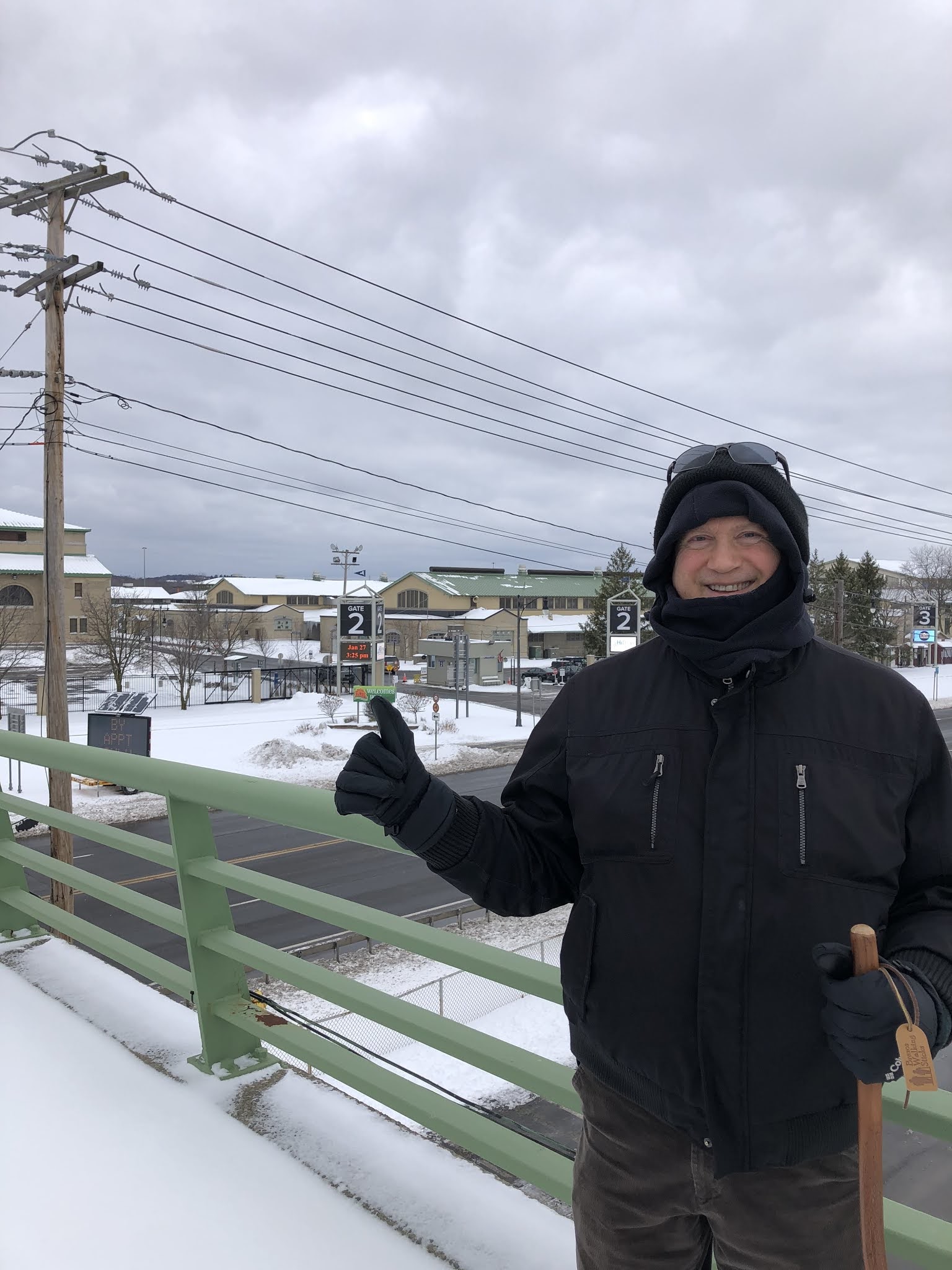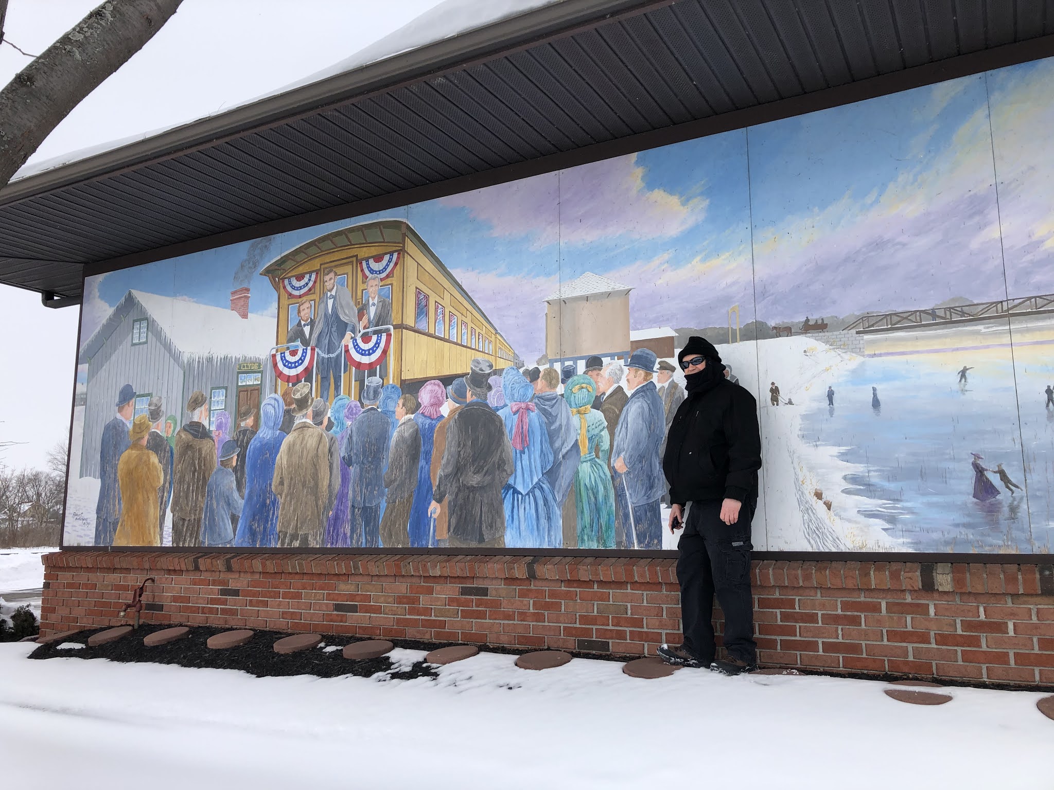 On Feb 18, 2021, Jim Saunders stands in front of the mural depicting Lincoln's inaugural train stop in Clyde, NY, which occurred exactly 160 years earlier on Feb 18, 1861. Ice skaters are seen on the Erie Canal. Excerpt from my epic poem, "Walking the Erie Canal: Secrets of the 8th Wonder, CMV and Pandemic Pizza" by Lisa Saunders: