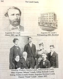 Jacob's son, Augustus Mortimer Leach, was educated at Geneva Academy, now Hobart College. Born the year the first Erie Canal opened, 1825, Augustus died in 1901, four years before construction began on the modern Erie Canal (once referred to as New York State Barge Canal). Augustus Leach's obituary tells of his career and states that Augustus "secured an early business training under his father Jacob in the milling business. In his college course he showed a natural talent for drafting and drawing, and after his graduation he worked as a draughtman for the corps of civil engineers engaged in plotting a new route for the Erie canal through [the Lyons] section. From them he acquired knowledge of civil engineering and he soon rose to a position of prominence in the department of state engineer and surveyor. In the early [18] fifties he was placed in charge of the engineering work on the western section of the Erie canal, having under his supervision the section extending from Syracuse to Buffalo. On the completion of this work he surveyed the Genesee Valley canal from Rochester to Olean [south and a little west of Rochester] and built a big storage dam at Cuba [near Olean]. During this period he also invented and drafted plans for the drop gate for locks that were accepted by the state and have continued in use to the present time [1901]. According to his obit: "From 1855 to 1857 [Augustus] was assistant state engineer under Van Rensselear Richmond of Lyons who was then state engineer and surveyor. During the latter park of that period, Mr. Leach lived in Rochester and Cuba, Allegany County. Later he became engaged in the milling business in Brooklyn together with his father-in-law and a Brooklyn miller under the firm name of Smith, Leach and Jewell. In a few years Mr. Leach, whose early training in the milling business under his father had adapted him for the work, bought out his partners and for ten years conduced the business alone. During the Civil War he had many contracts for furnishing supplies to the government, and both then and at its close his business was remarkably successful so that in 1870 he had amassed a fortune on which he was well able to retire... "
