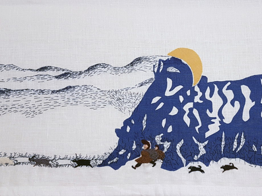 Detail, History (tapestry), Britta Marakatt-Labba Some years ago I had the pleasure of viewing Marakatt-Labba’s tapestry, titled History, imposing in size (20 meters long), but also captivating in its embroidered figures and landscapes from Sami history in on a long wall at the Arctic University of Tromsø. This is the tapestry’s first exhibition in Oslo, though it’s also been shown in New York and Europe.For more details, see the exhibition’s brochure (PDF).