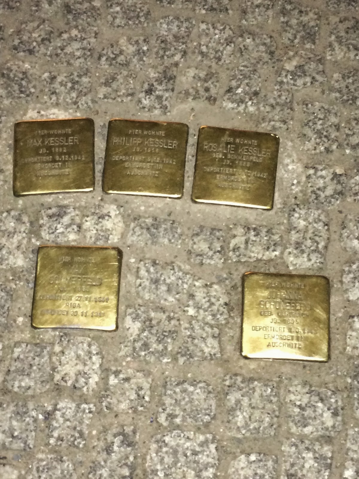 There are five Stumbling Stones, or Stolpersteine, outside my friend, writer Kenny Fries’s apartment. As I stare down at them, Kenny & his husband Mike wait patiently for me to grasp the import.