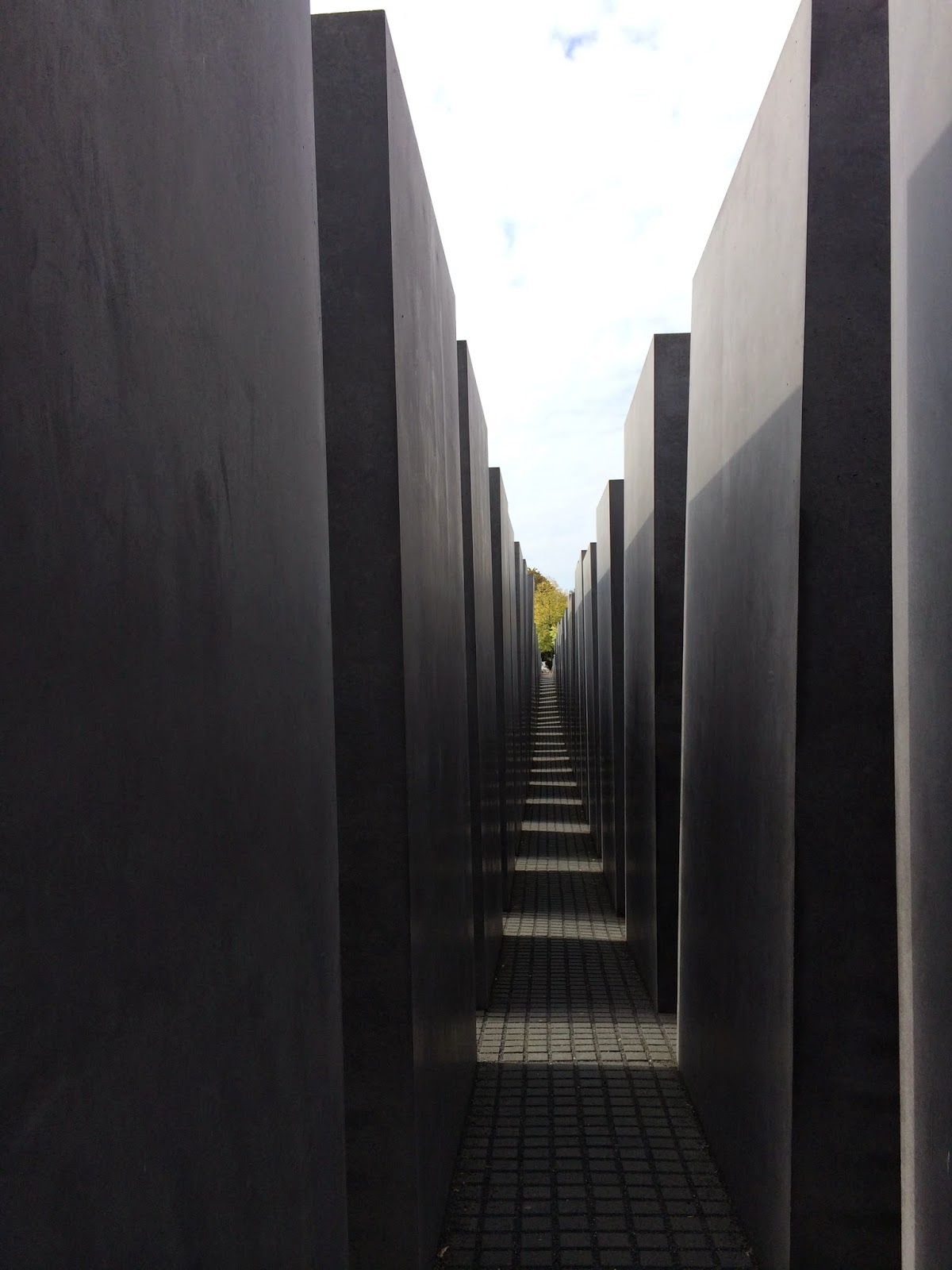 In St. Petersburg & in Gdansk, I saw wounded buildings, slashed with horrors of war, & bandaged with colorful new facades, but somehow the bloody past always leaks out (see my previous post on Gdansk). In Berlin, the Jewish Museum & the Holocaust Memorial provide interesting switches. The Jewish Museum, with the broken Star of David on its punctured facade, works with the senses to recreate the terror of Jews in Germany during World War II. The ground shifts beneath your feet, white noise accompanies you, & walls close in, leaving you dizzy & claustrophobic. The Holocaust Memorial, with its maze of coffin-like gray pillars lining narrow corridors & abrupt Escheresque twists & turns, makes you doubt the faint light at the end of the tunnel … as if you’ll wander down these dark corridors like Kafka’s Joseph K for the rest of time. At every corner, you stumble over memories & ghosts, & “Jew” whispers in your ear.