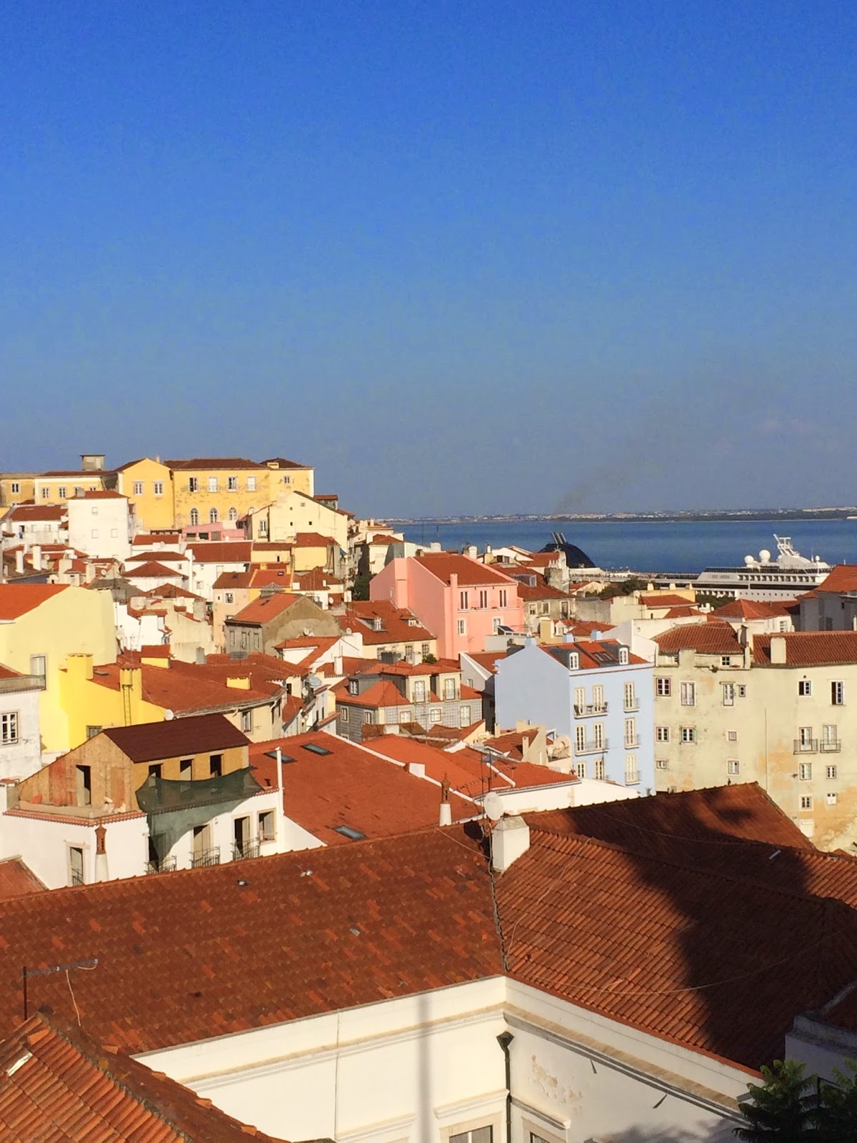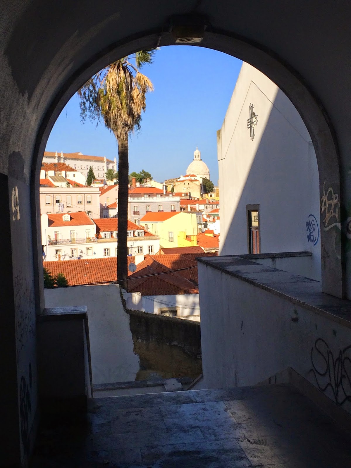 Lisbon is like a city in a dream—you turn a corner & have no idea where you’ll find yourself. A narrow, shabby street in which every building is covered with graffiti opens onto a vast sunny marble square lined with columns & cafes. A set of impossibly steep stone steps leads to an ancient cathedral. Winding cobbled streets, tiled Moorish archways, shadowy stone corridors & courtyards bump against weighty stone castles & fortresses. Laundry hangs from balconies—a pair of harem pants swaying in front of a doorway beckons me into a shop where I learn they belong to the upstairs neighbor. Over another shop, a man sits on his balcony, plays his guitar & sings. I realize that I love cities with balconies—they merge the inside & the outside, & invite the passerby into the street drama.