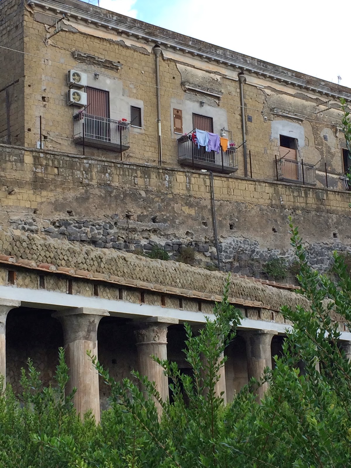 Tomorrow I will go to Herculaneum, Pompeii’s little sister, & the instant I enter, I feel a sharp pain, a blow to the gut. Tears burn my eyes. The town is so small & homey, almost intimate after the grandeur of Pompeii. It is divided into little blocks, houses, shops, corners & gardens. Vesuvius looms overhead, cloaked in clouds, & the modern town coexists peacefully with the ancient one at its feet like a slumbering cat. Laundry, of course, hangs from balconies. A man sings opera (that’s three times in three days I hear a man singing opera!), the passionate drama in his voice perfect for this place, this moment.