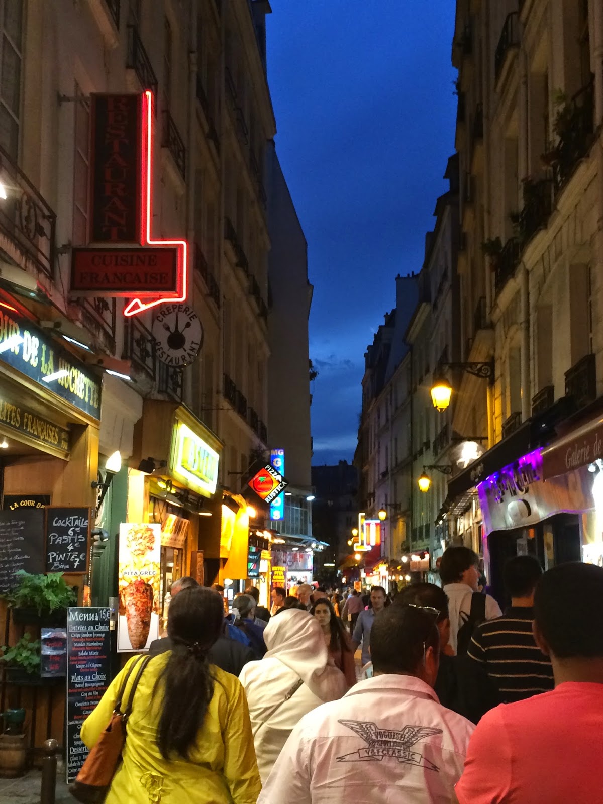 Enter the Hotel Sully near the Bastille, walk through to the garden, & you will emerge in the Place de Vosges, Paris’s oldest square, lined by a mysteriously shadowed corridor. Keep walking, & you find yourself in the Marais, the old Jewish quarter. Now a network of trendy stores, galleries & cafes, but there is the wonderful surprise of the rue des Rosiers with its Hebrew signs, store windows with sacred books, & tiny restaurants offering kosher falafel & shwarma, just like in Jerusalem. Stand in line at l’As de Falafel with a dozen others, buy a falafel in pita stuffed to the brim, take it to a small shady park around the corner, & sit on a bench for more people-watching. Paris—like every European city—is multicultural, & I hear French spoke in many different accents.
