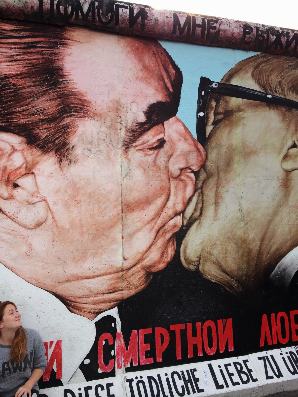 In the train station an art exhibit is devoted to an internationally known street art group that moves from city to city, films their work in documentaries, puts together (expensive) volumes of their art, & signs themselves: 1UP. No personal signatures, just 1UP, which comes from Super Mario Brothers, & can stand for 1 United Power. Street artists know their work will be plastered over, repainted by the city & other artists. That doesn’t concern them. What’s important is the thrill, the moment. Street bombing, murdering a wall, the explosion of art—a happening. And then, moving on. The next wall, the next challenge, the next city.After Ben leaves, I walk along the remaining parts of the Wall, known as the East Side Gallery, possibly the largest outdoor art gallery in the world. The Berlin Wall—painted, graffiti’d, layer upon layer, smeared & sprayed to the last inch. Street art at its ultimate power: the voice of the people speaking out, protesting, creating beauty (however you define it) in the face of repression.