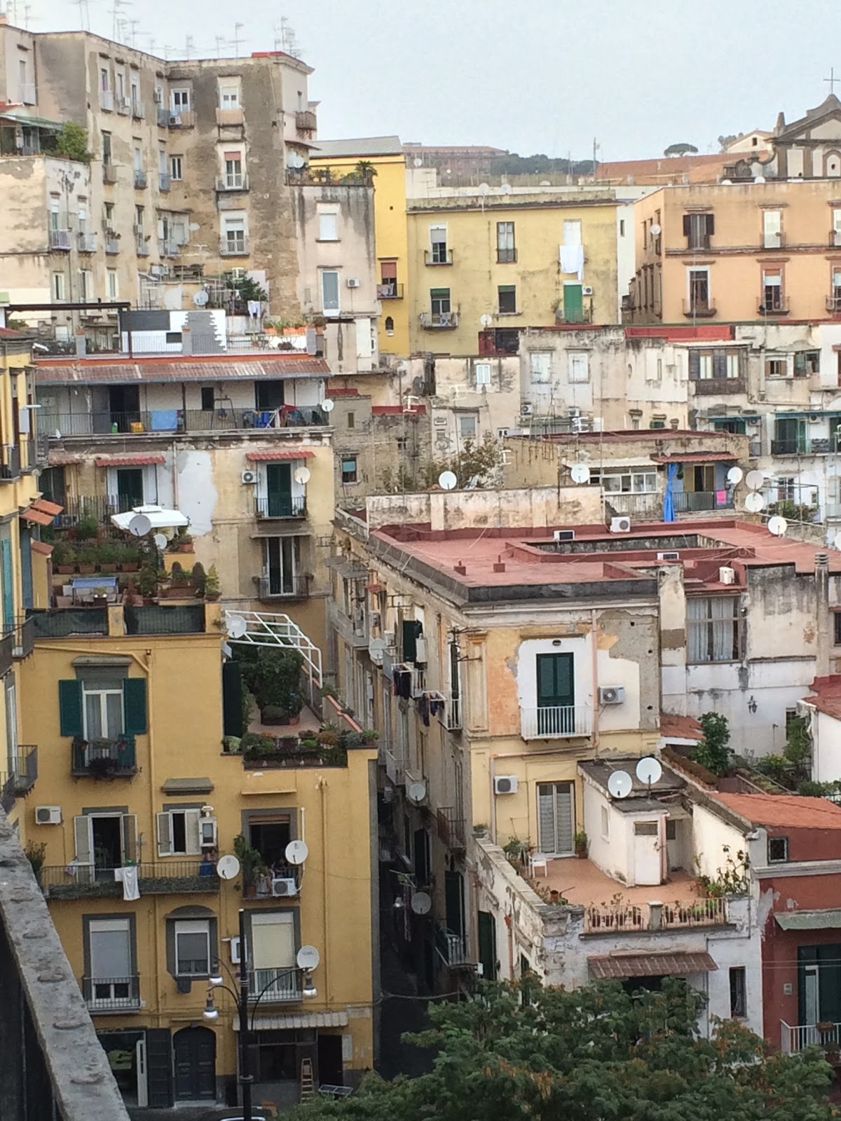 My first view: from a balcony in the Museo Archeologico Nazionale di Napoli, whose wide windows open onto gardens & courtyards, streets & buildings. The dark, dazzling panorama of the city is as fascinating & breathtaking as the incredible art inside its seemingly endless rooms. I move from the exquisite embarrassment of the Pompeiian baker Terentius Nero & his wife frozen forever in a painted fresco to a balcony where three American students pose for selfies—no embarrassment here—& car horns blare, tires screech, TVs blast, & a man sings opera at the top of his lungs.