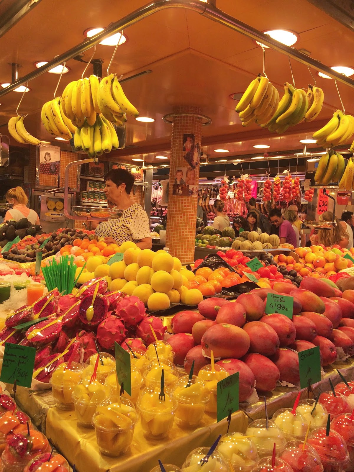 Barcelona cries, “Eat me! Drink me! … How can I refuse the invitation to enter La Boqueria, the market to end all markets? Fruits and vegetables plump and gleaming, begging to be touched, rows of brilliant colored fresh-squeezed juices and plastic cups heaped with fruits. Pyramids of candies—chocolates, jellies, marzipan fruits, cocoa-dusted nuts—a cornucopia of sweets bursting open. Vast slabs of meat sway over stands, fish and unrecognizable sea creatures seem to wriggle on counters. Locals stride directly to the stand they want while tourists wander in a dazzle of colors, smells, textures gone wild.
