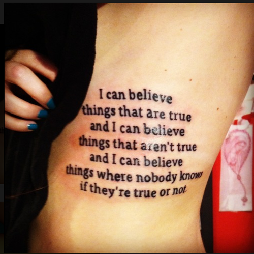 (A quick Google Image Search turned up many dozens of wonderful literary tattoos... here are quotes from Instructions, Sandman, The Dangerous Alphabet, Stardust and American Gods.)