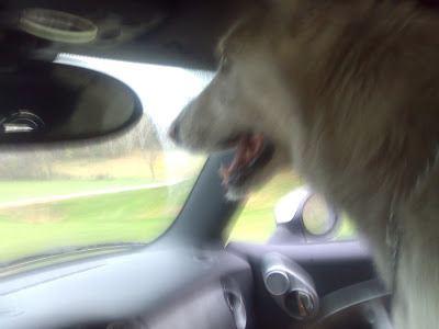 I phoned my assistant Lorraine, and asked her to let the local Humane Society (really nice people with a no kill policy) know we'd be coming in soon with a dog, then I drove home, narrowly avoiding death on the way (it's amazing how much you can't see when a huge dog fills the car and your field of vision). I ran around the garden with Dog until he'd tired me out. (I really hope he'd just got lost, and his family are looking for him; it would be hard to imagine someone abandoning a dog that cool.) Then I put him into the back of a car much bigger than the Mini and took him to the Humane Society, where they fawned all over him. ("I think he's a husky-wolf cross," said the Humane lady who took him, and she could be right.)