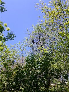 I walked the dogs in the woods. I heard something buzzing gently, and it seemed to be a tree. I looked closer... It was a swarm of bees high in a buckthorn tree...