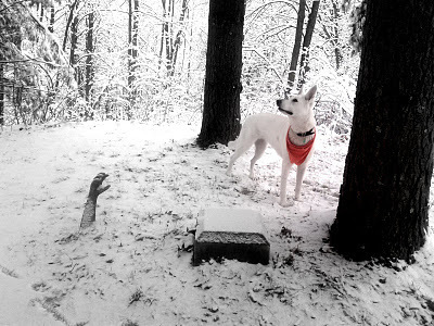 here is a photo of my dog Lola, down by the gravestone by the gazebo, to make it up to you:
