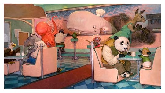 I am astonishingly proud of a book I wrote that Adam Rex is currently painting, intended for very young readers indeed. You can find out about it at Adam's blog http://adamrex.blogspot.com/search/label/chu. Here's the first finished picture from it, set in the Moby Diner. Our hero is in the bottom right-hand corner with his back to us.