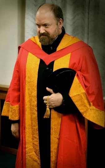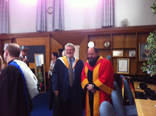 Let's see. My old friend and collaborator Dave McKean was made an honorary Doctor of Design in Wolverhampton. I do not think I have ever seen him look so uncomfortable as in these photos. Wish he'd kept the hat on, though.