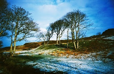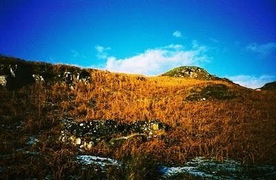 Me: You know, George, I think that wood over there is where the golden eagles nest. There's a pair I've seen around a lot -- the ones I saw eating that hare -- and they always seem to go back to the wood around that black house on the hill. I've spotted both of them perching in those trees...