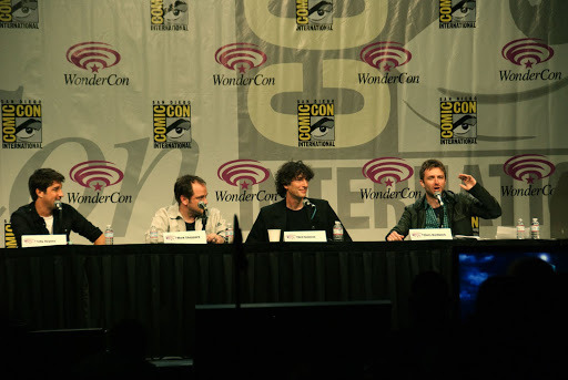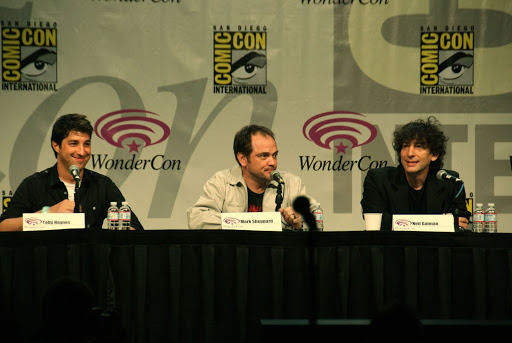I had a late dinner with the Chabons and got up early the next morning, worked out for an hour (not as virtuous as it sounds, the getting up early - I think I was still on UK time) then went to breakfast. A gentleman who looked sort of English looked at me and said "you're Neil?" and I admitted that I was. He was actor Mark Sheppard. I moved my food over to his table, and we were soon joined by director Toby Haynes and Nerdist Chris Hardwick.