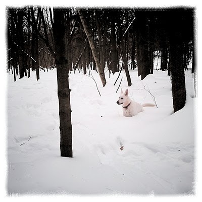 So I'm home, and it's warmed up. The snow has gone soft, but almost none has melted. It looks like this right now out in the woods.
