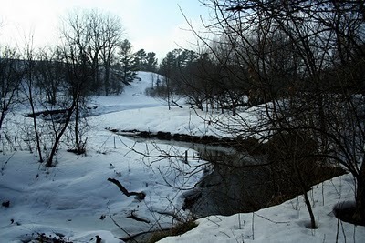 I thought this was something that might be happening one day. But the weather today was perfect, for winter -- warm enough for a vague mist to scumble the world and make it feel like there wasn't anything but what you were seeing, and what you were seeing was trees and snow, mostly.