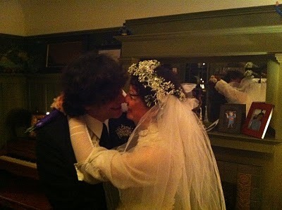 Probably getting married in a friend's parlour, with a dozen friends around who weren't really expecting this but who threw themselves into making a wedding for us out of nothing, and a daughter and a son lending their support and love, isn't how everyone would plan a wedding. But we'd been engaged exactly a year, and it felt incredibly right to improvise a wedding as we went along. So we did it. And were as happy as any two people had ever been.