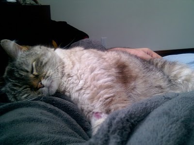 I slept in the attic bedroom again last night. Zoe seemed weak and listless when I went in, and was huddling on the floor by the heater. She smelled weird, like bile. She got out of bed a couple of times in the night, to throw up a couple of teaspoons of foam. Then I'd clean her up and bring her back to the bed, and she'd snuggle and purr.