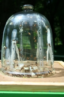 For those wondering about the Belljar -- my theory that the bees would do whatever it was the bees would was right. As soon as it went onto the green hive, the bees invaded it. They checked out the strips of white wax I'd put in, sniffed dismissively, went "Obviously done by an amateur" and began to remove them. These two photos are from about ten days ago.