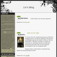 During the whole horribleness that is Liv's journey through Missing, I had Liv keep a journal. It never appears anywhere in the book since the book is first person. Instead, I used this journal to help me write and craft the story. I have now taken a few of those entries (those that Liv wouldn't have minded becoming public), and I've created her own blog. It's short, but it shows some of what is happening to her in that first month after her brother Morte's disappearance. Click the link at the top of the page, or visit her blog here.August 21, 2011