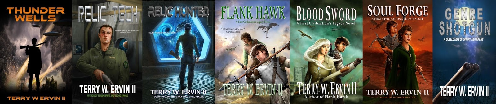 Terry W. Ervin II is an English teacher who enjoys writing fantasy and science fiction. Beyond his new release, Thunder Wells, his Crax War Chronicles(science fiction) includes Relic Tech and Relic Hunted, and his First Civilization’s Legacy Series (fantasy) includes Flank Hawk, Blood Sword and Soul Forge . His short story collection, Genre Shotgun, contains all of his stories previously published in magazines, ezines and anthologies.