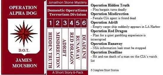 My name is Jonathon Stone. Like a lot of single, All-American men I enjoy gambling and drinking and the ladies.I am a writer for the Real Sportsman Magazine. At one time our offices were located in downtown Long Beach, CA. On the main floor was a complete magazine group with secretaries and a writing staff that produced a monthly magazine.Being a writer is a realistic, workable cover because I am, in reality, a Special Agent for the CIA. I am assigned to the west coast based – Far East Operation Center located in San Francisco.In the basement of that office building was a full blown CIA operation with a security setup and computer center.About a year ago, our cover was blown and the staff was scattered to the wind. My boss, Russ Evans, changed my status to At Large and kept me in the Long Beach, CA area. Actually, Belmont Shore, if you want to be more specific.I am what my fellow agents call an Asset On Call. I may show up anywhere in the world.As a footnote, we also handle the Domestic Operation - Terrorism (DOT) division. It was formed to handle terrorist threats inside the U.S. after DHS took control of intelligence.This group is not on the Company’s organization chart.Jonathon Stone