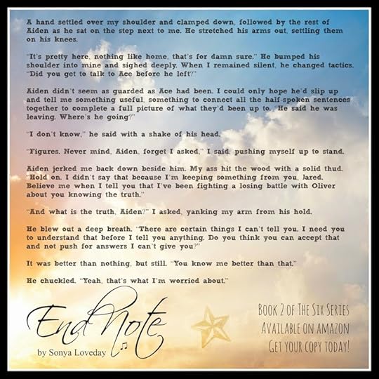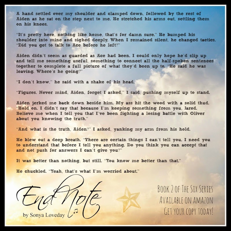 One he wasn’t prepared for… and one he can no longer escape from.Will Jared rise above the destruction or will his new circumstances be his undoing?Find out in the next installment of The Six Series, End Note, a new-adult romance.Are you ready to get sixed?