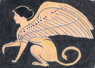 Most everyone is familiar with the Egyptian Sphinx at Giza, towering over the sandy landscape, facing the rising sun. Its animal form, the lion, has long been a symbol associated with the sun. The Giza sphinx is carved out of bedrock and is the largest single-stone sculpted statue in the world. Perhaps as long as ago ca. 8000 BC the great sculpture was part of a megalithic observatory. Four thousand years later, two pillars were placed in front of the sculpted monument to facilitate measuring the movement of stars and planets. An Egyptian Pharaoh had the sphinx's head re-carved in his own image. For the Egyptians, sphinx statues represent kings or gods and are usually male; they are symbol of divine sovereignty.