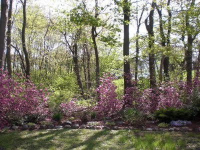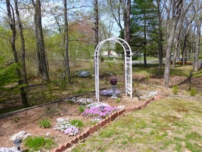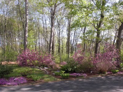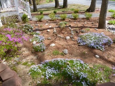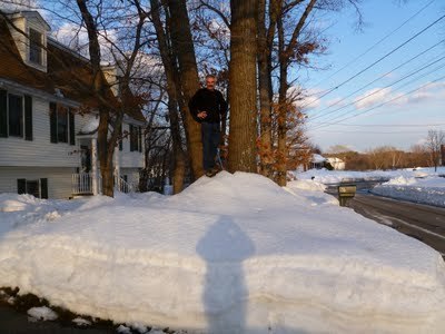 I love my yard especially in May when everything is in bloom especially since we had so much snow this past winter. Here's what the front of my house looked like in February after the snow bank had gone down about a foot. That's my husband standing on top of the mound of snow.